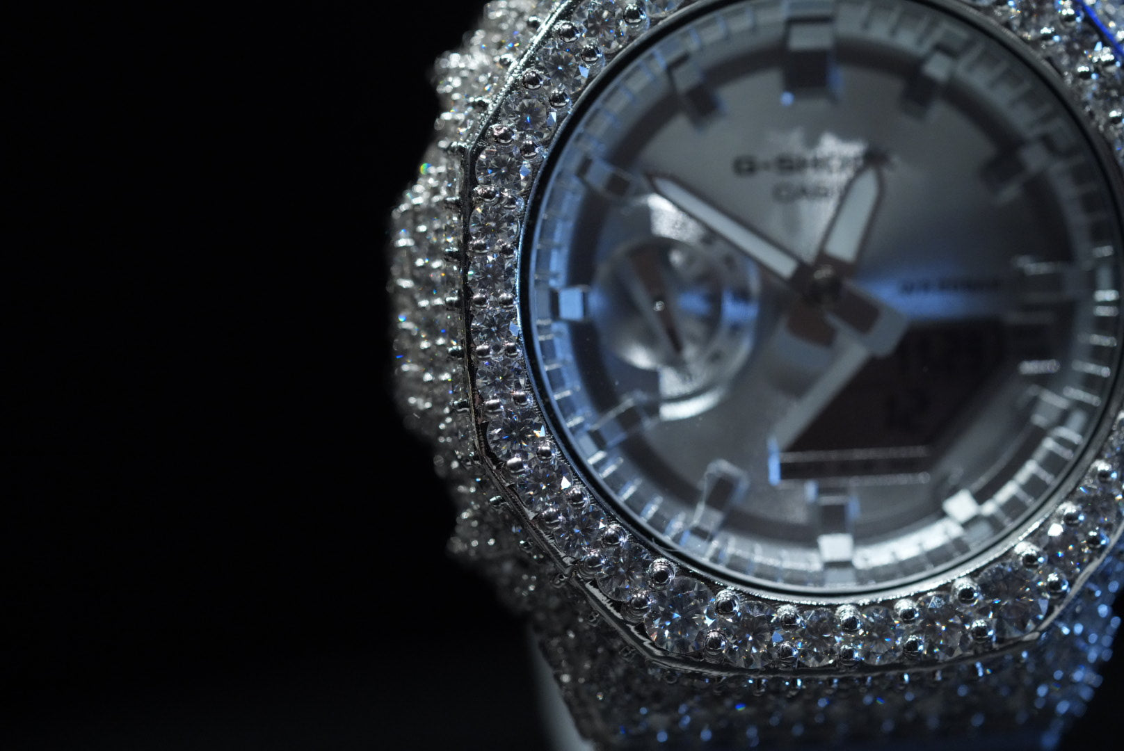 We offer a full natural VVS/VS diamond upgrade option. Please reach out through our Custom Request Portal to begin your personalized natural diamond G-Shock.