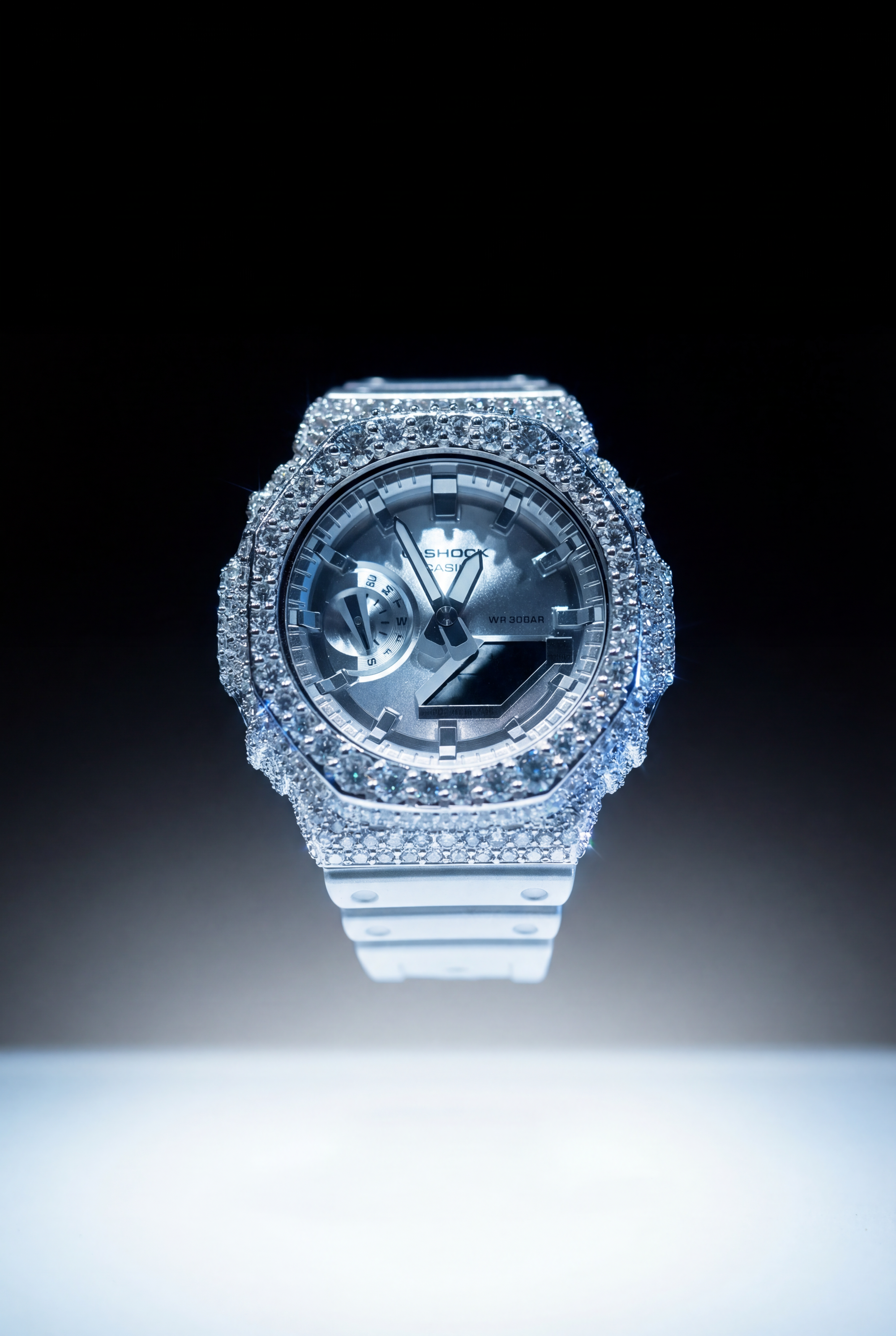 Experience the perfect fusion of rugged performance and luxury brilliance. This custom Diamond G-Shock features a fully iced-out design crafted with hand-set VVS1 CVD lab-grown CVD diamonds, precision-cut for maximum fire and clarity. The watch retains its iconic durability while elevating your wrist with a bold, high-end sparkle that stands out in any setting.