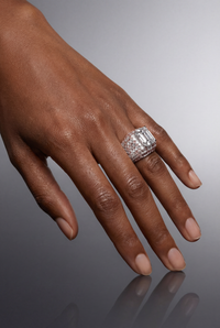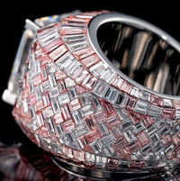 Surrounding the center is a meticulously constructed full invisible-set baguette layout, creating a seamless diamond surface with no visible prongs or metal interruptions. Each baguette is precision-cut and perfectly aligned for a smooth, continuous shine across the entire band. The result is a clean, modern, and ultra-luxury aesthetic usually seen only in high-end designer houses.
